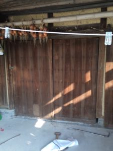 3枚建て引戸のしたことで以前の引戸より約0.5枚分広く開くようになったので、農機具の出し入れが楽になるように仕上げています。